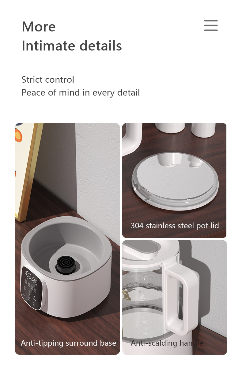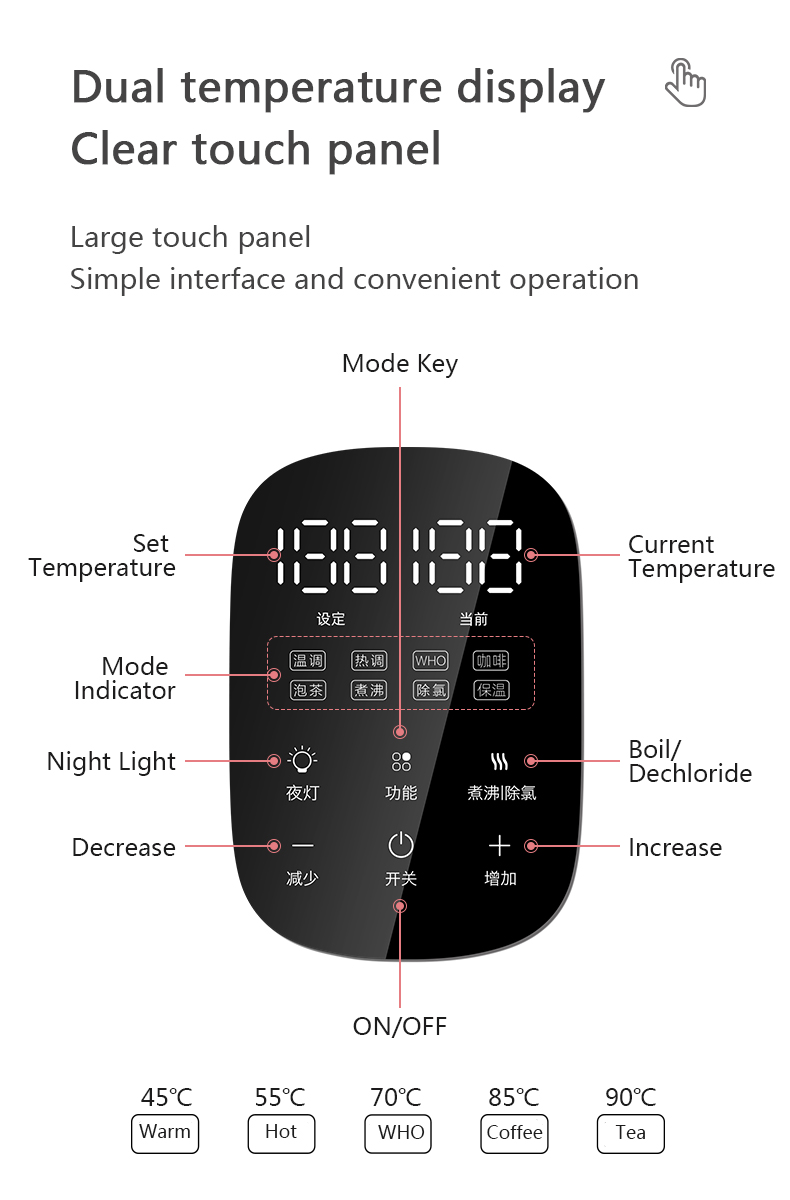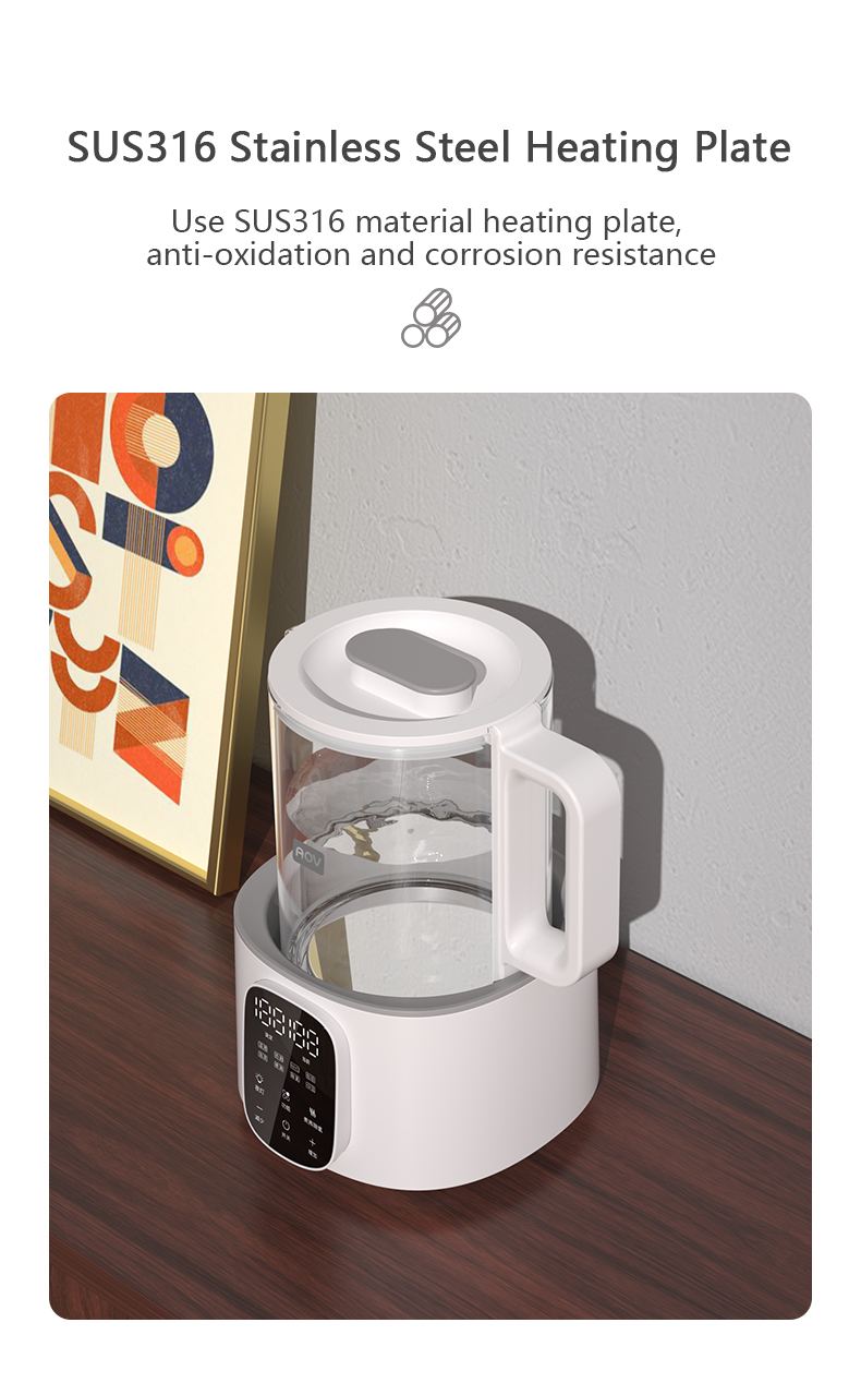 Adopts advanced microcomputer temperature control, balanced heating technology, sensitive control, convenient touch, and integrates functions such as heat preservation, boiling, and dechlorination; intelligent touch screen operation and microcomputer control, easy to operate. It has the characteristics of rapid heating, constant heat preservation, and convenient use, and is a good helper for mothers to raise children.