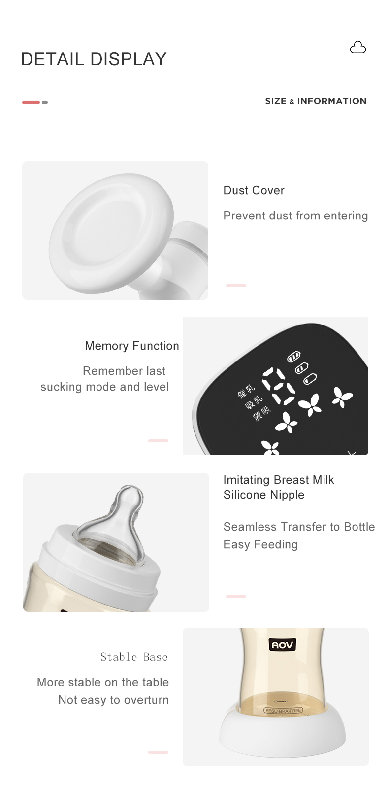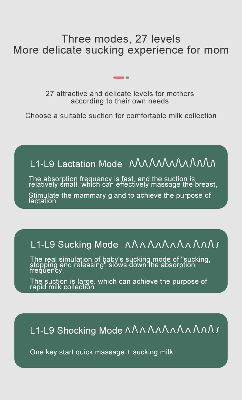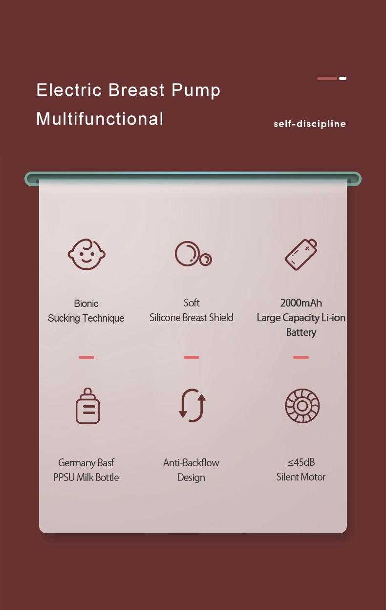 Intelligent multiple modes, nine adjustable levels PPSU bottle, resistant to falling and disinfecting Wireless charging function for mobile phone Built in lithium battery, ready to use Anti-backflow design, closed system Food grade material, B