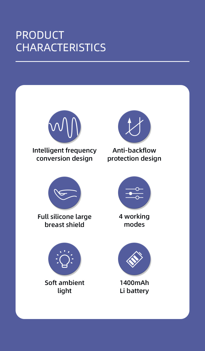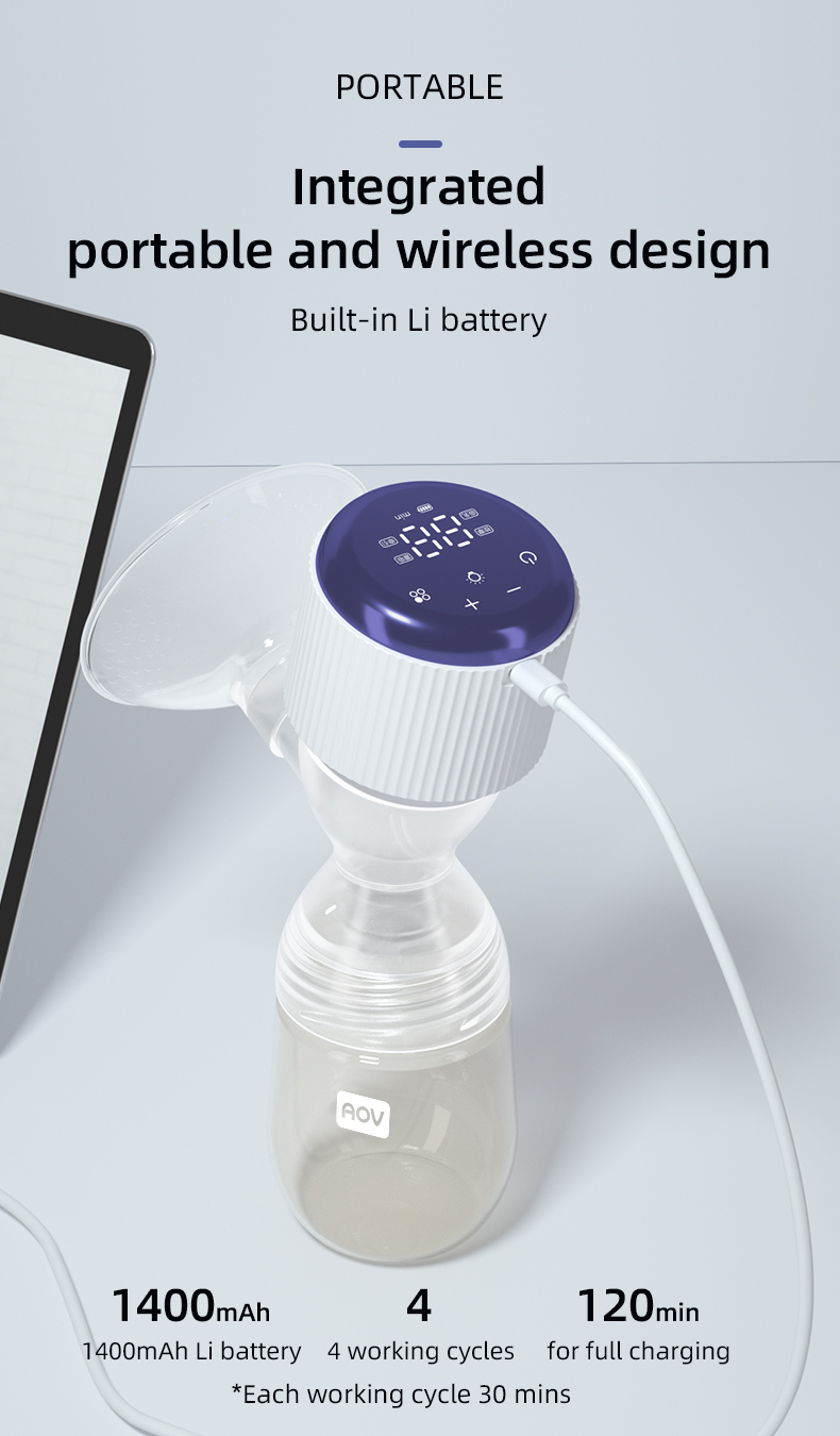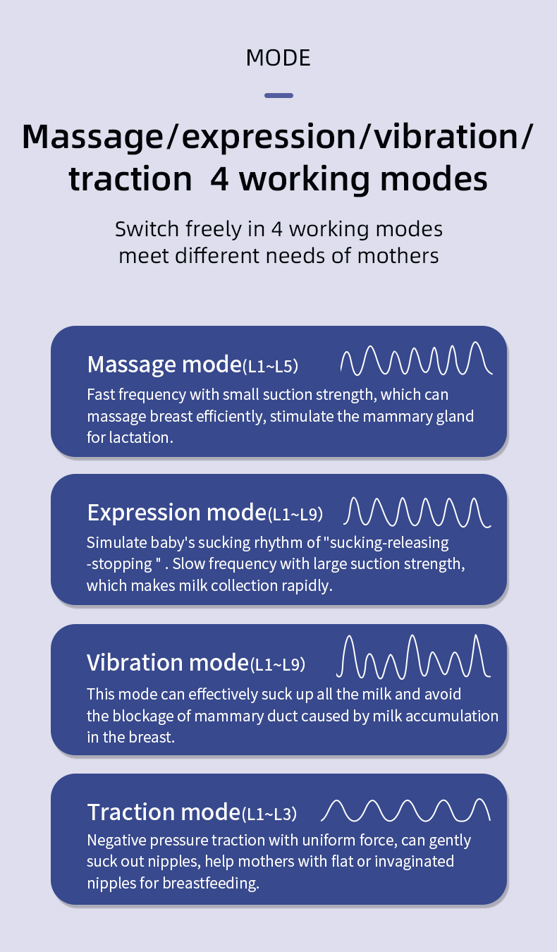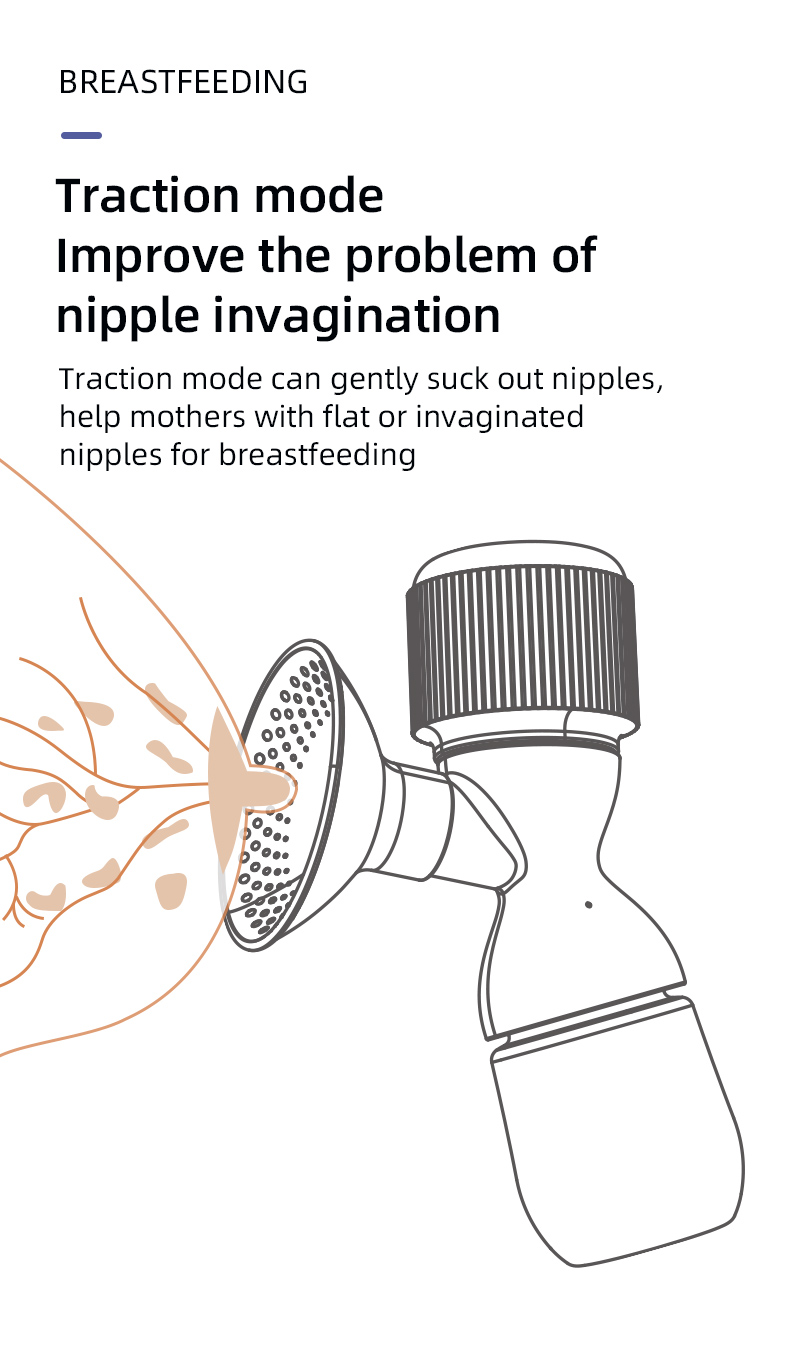 1. Integrated type of breast pump; 2. 4 operating modes (stimulation, expression, buffering,traction ); 3. Suction level is adjustable, easy and convenient