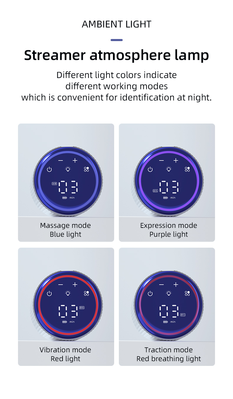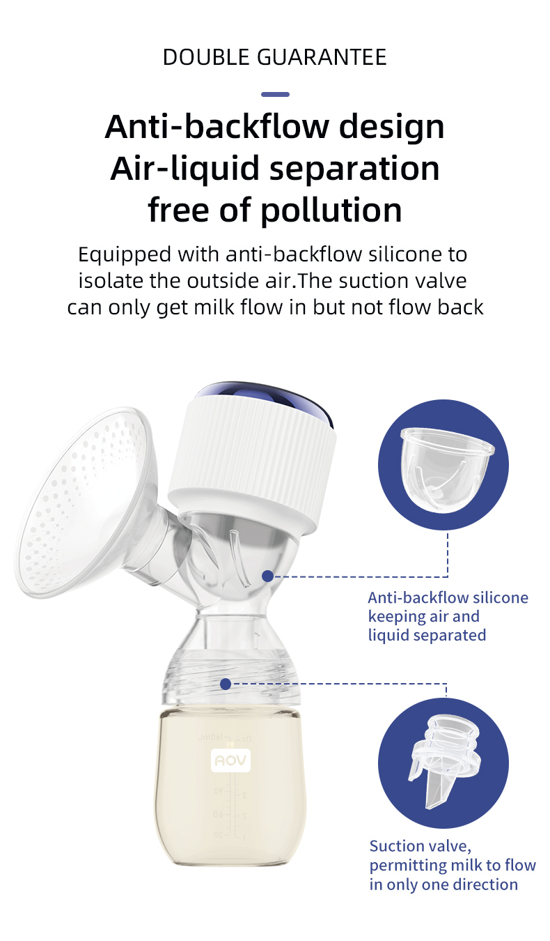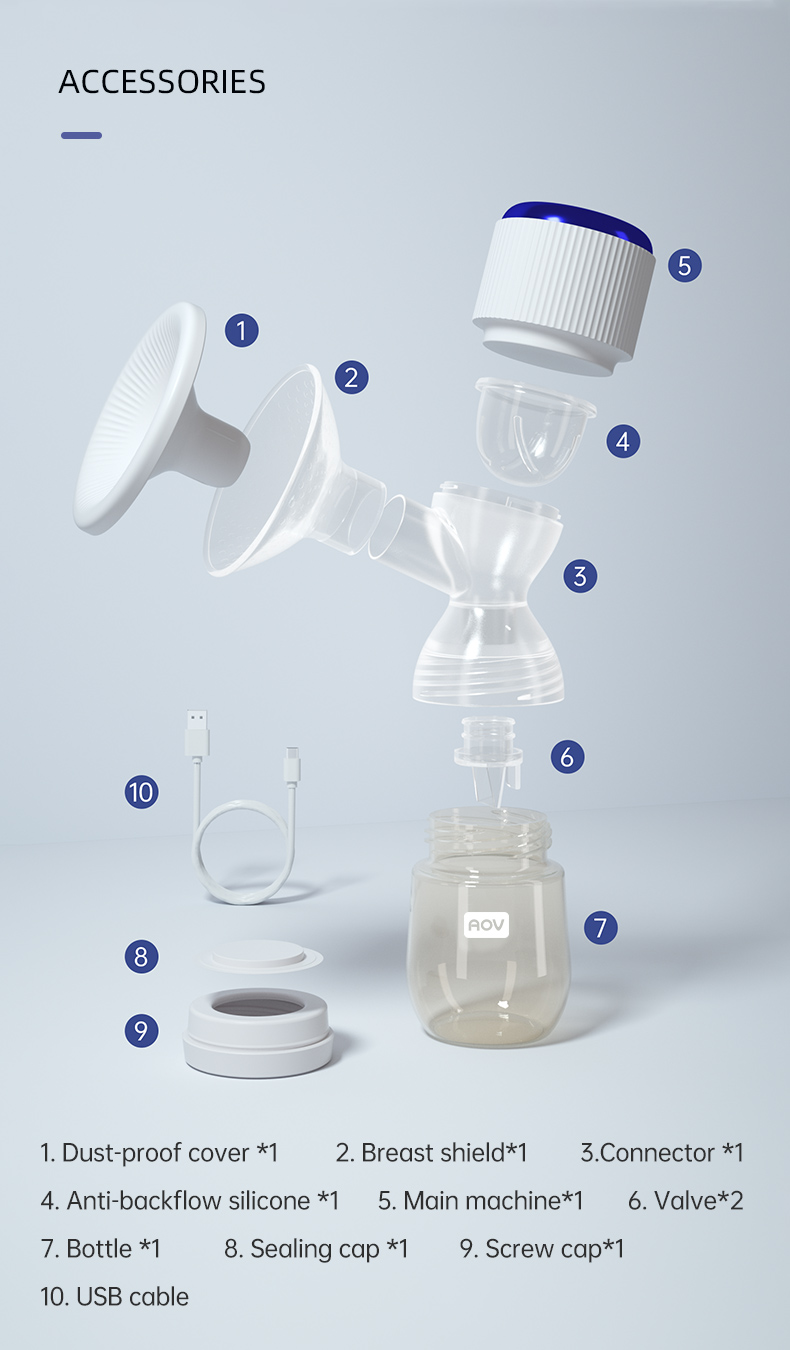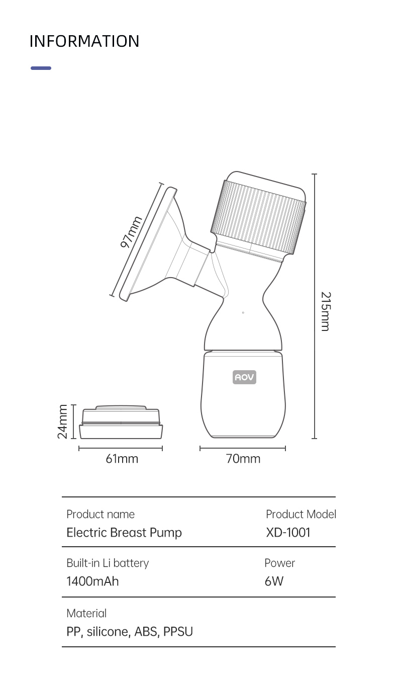 1. Integrated type of breast pump; 2. 4 operating modes (stimulation, expression, buffering,traction ); 3. Suction level is adjustable, easy and convenient