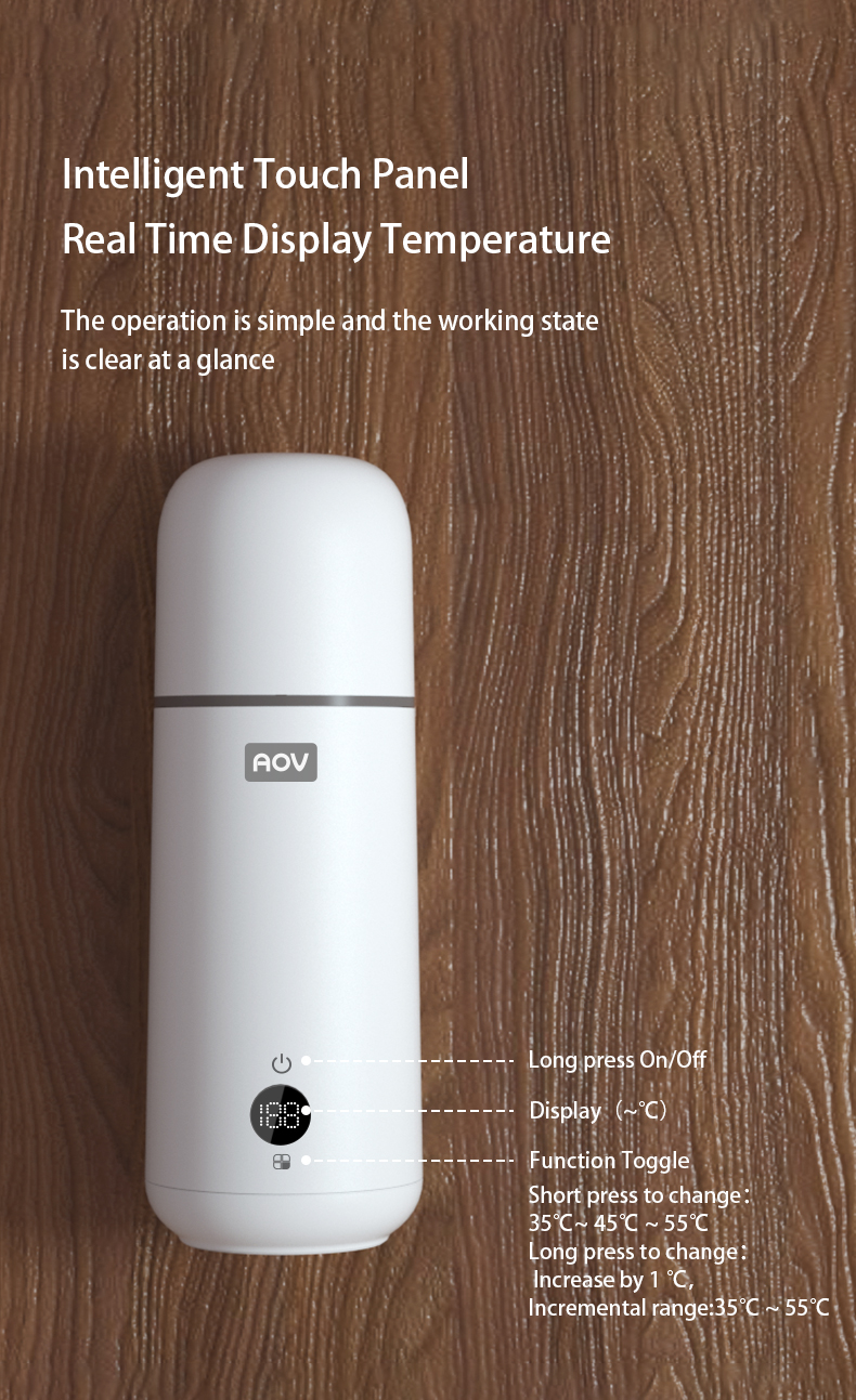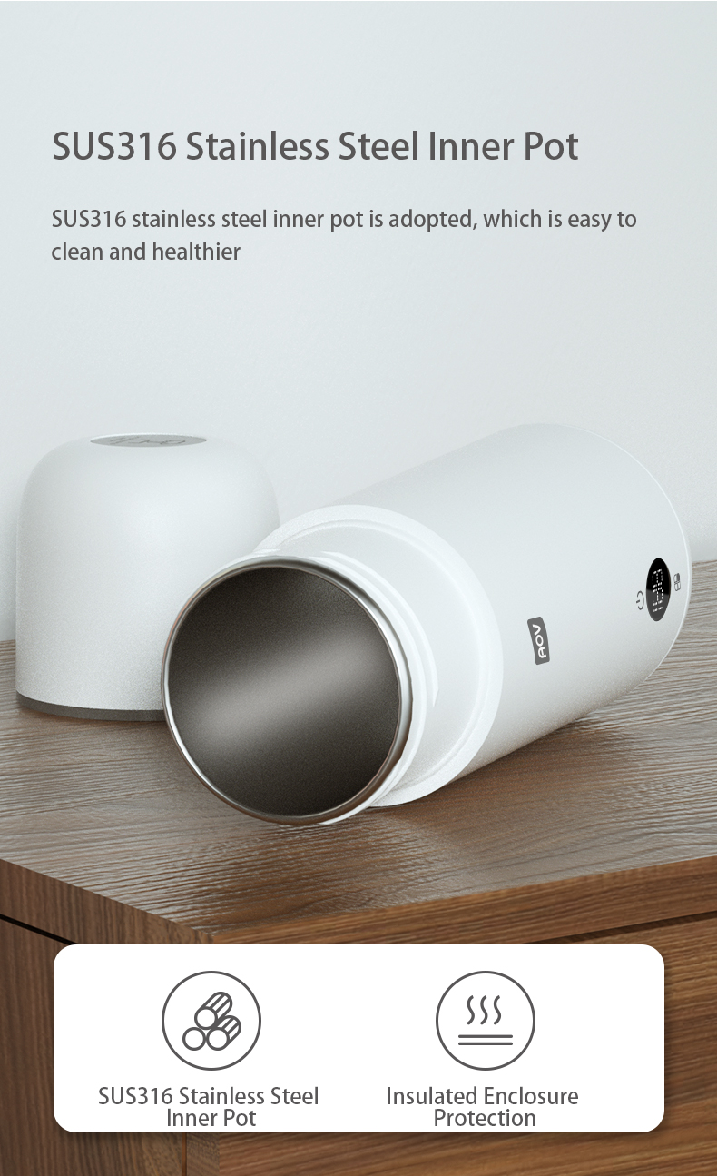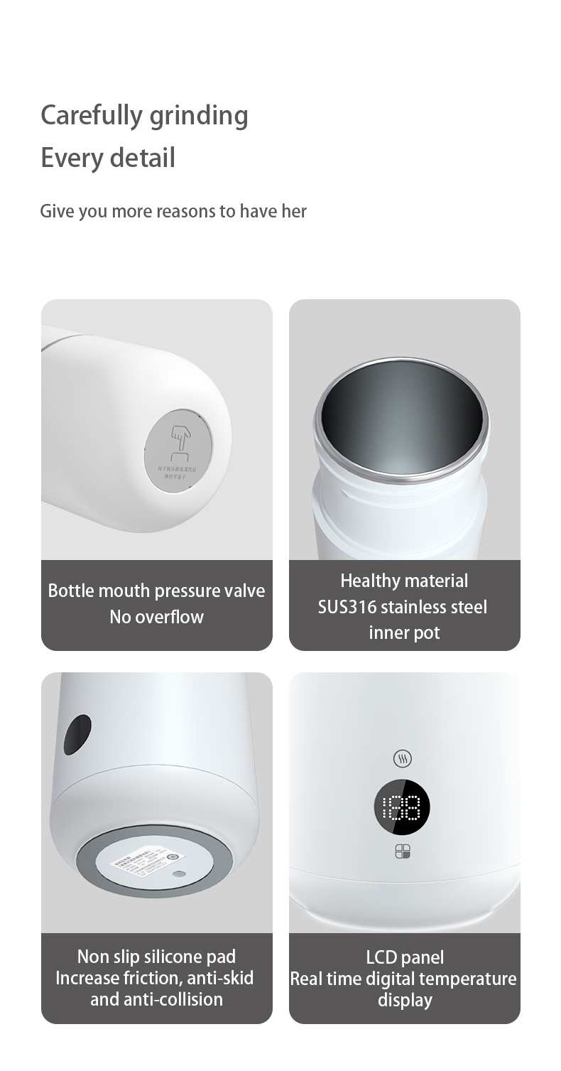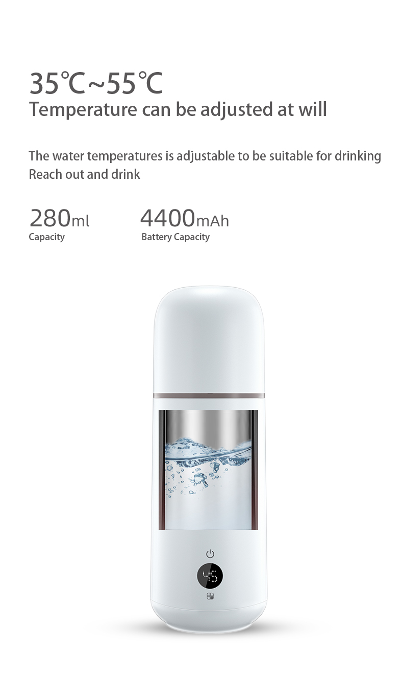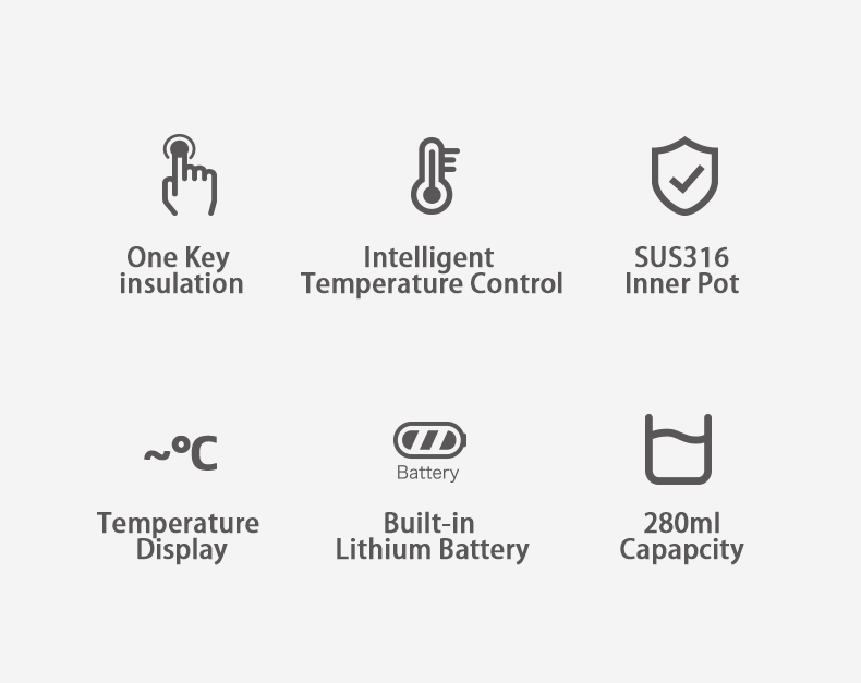 1. 280ml Capacity. 2. The temperature can be adjusted by 1℃ for each time within 35℃ - 55℃. 3. Built-in rechargeable lithium battery. 4. Mini, portable, suitable for travel purpose.